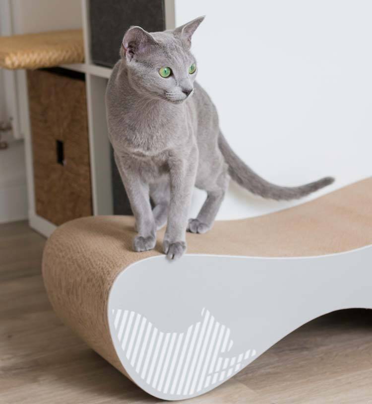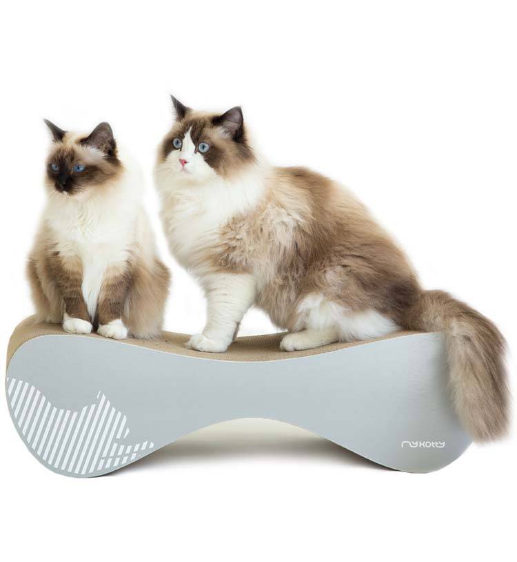 Een modern en fraai design grijs krabmeubel, dat volledig met de hand wordt gemaakt. Het is gemaakt van golfkarton, waar katten helemaal dol op zijn. Het prachtige design maakt het meubel tot een heuse blikvanger in elk interieur.