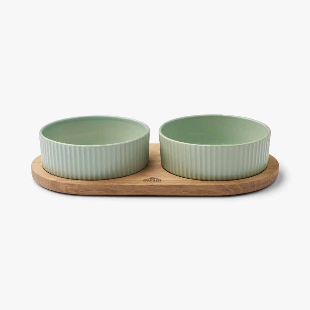 Een zeer fraaie design dubbele drink- en voerbak die is uitgevoerd in een warme en neutrale bruine kleur. Op de eiken onderlegger passen de twee bakjes perfect,