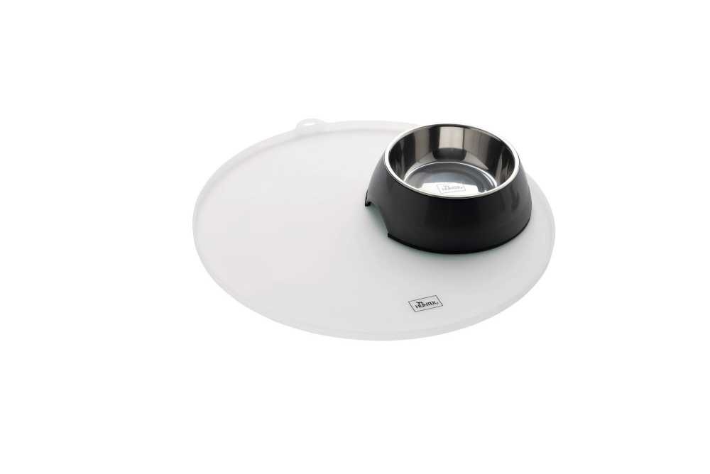 Een fraaie transparante ronde onderlegger met een opstaande rand waarop de drinkbak en voerbak voor de hond of kat gezet kunnen worden.