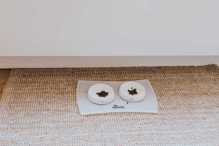 De onderlegger zal op zijn plaats op de vloer liggen. Het voorkomt niet alleen dat nat en droog voer aan de vloer blijft kleven, het voorkomt ook dat de voerbak of waterbak kantelt of verschuift. De extra hoge rand van de onderlegger vangt niet alleen voedsel op, maar houdt ook water vast dat uit de kom is gemorst.