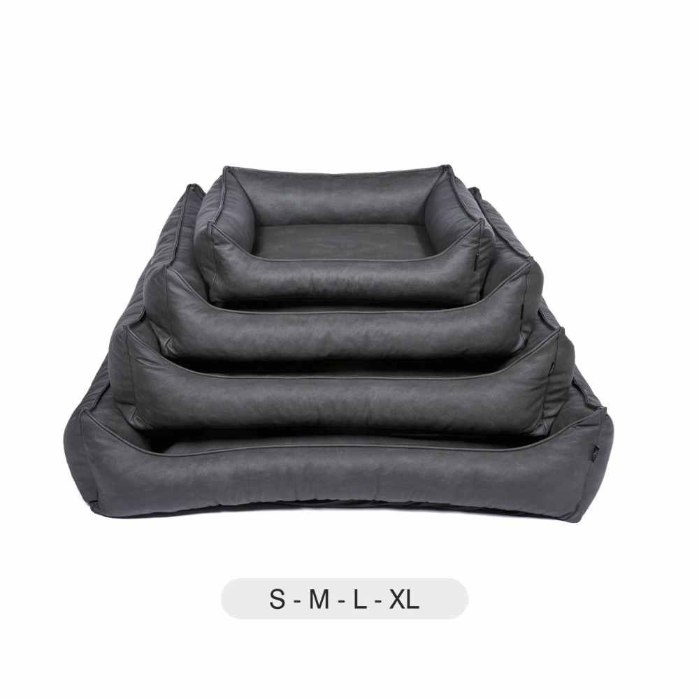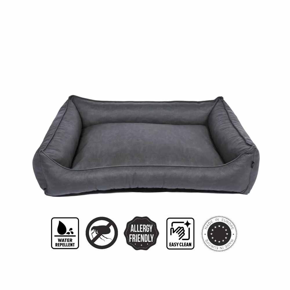 Een robuuste en comfortabele donkergrijze kunstleren hondenmand met een vulling van koudschuim. Het ligvlak is gevuld met gemalen memory foam en zorgt voor een optimaal slaapcomfort.