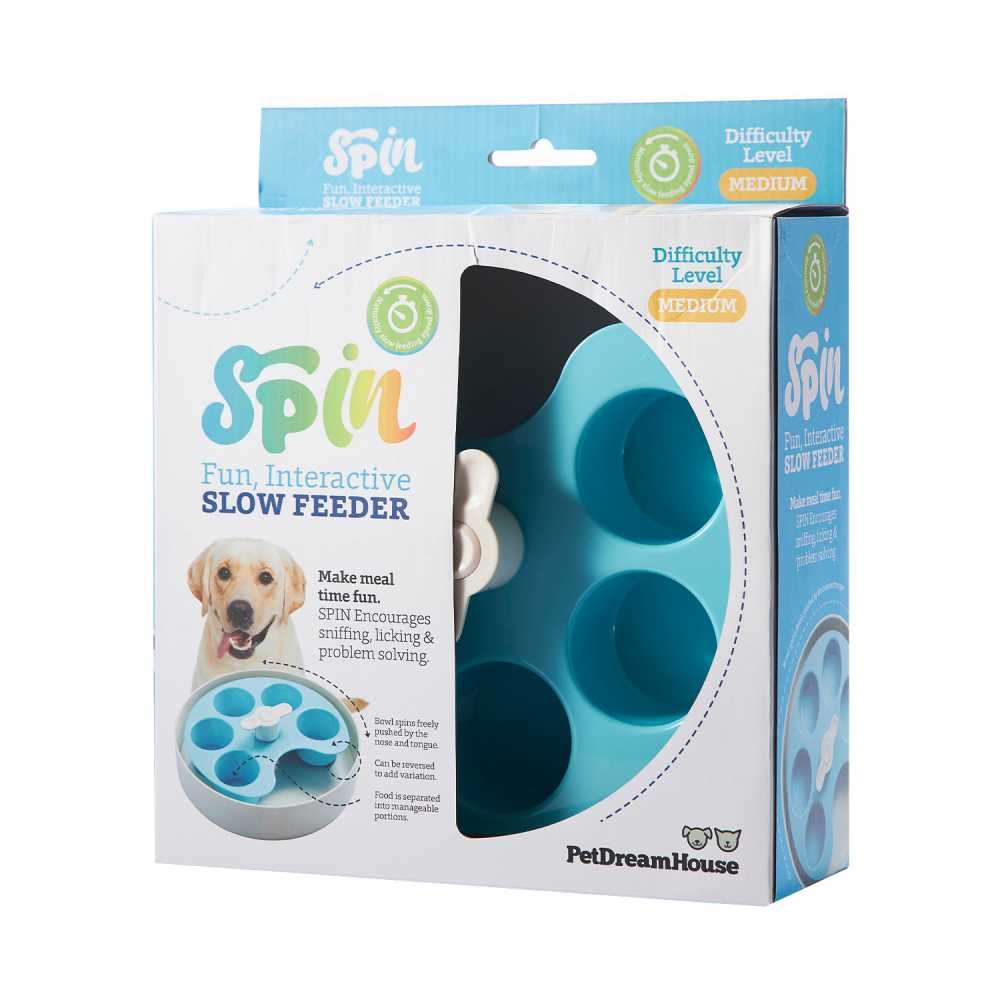 De Spin is ’s werelds eerste anti schrok bak met vervangbare accessoires. De complexe structuur moedigt het natuurlijk gedrag van de hond aan. De hond wordt geprikkeld om te graven, snuiven of likken. Hierdoor wordt het tempo om het eten vertraagd en wordt het risico op verstikking of andere mogelijke gevaren van te snel eten voorkomen.