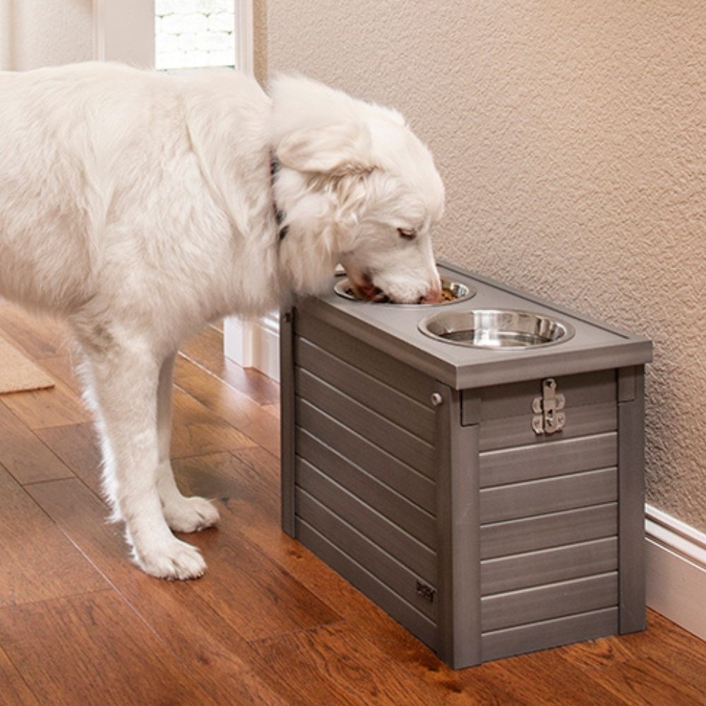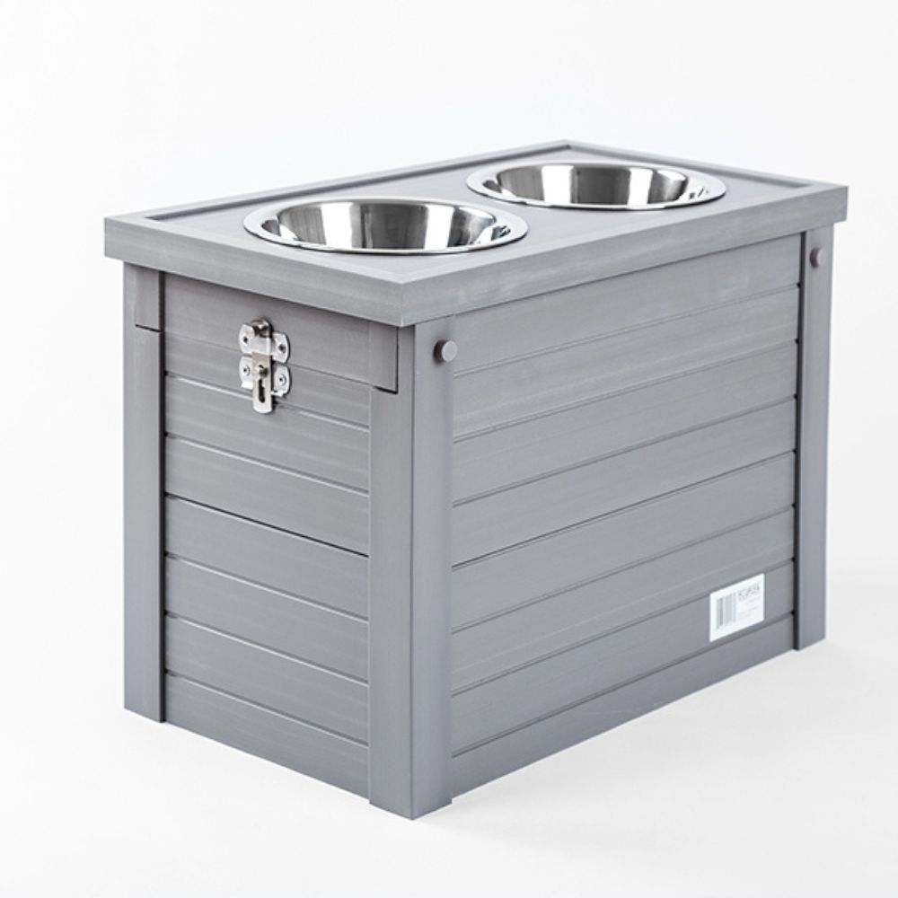 Het design van de Piedmont Diner XL is zowel functioneel als stijlvol. De deksel schuift soepel open en bevat twee roestvrijstalen kommen, die eenvoudig schoon te maken zijn. Onder de deksel bevindt zich een ruime opbergruimte waar het voer, de traktaties, riemen en nog veel meer kunnen worden opgeborgen. bewaren.