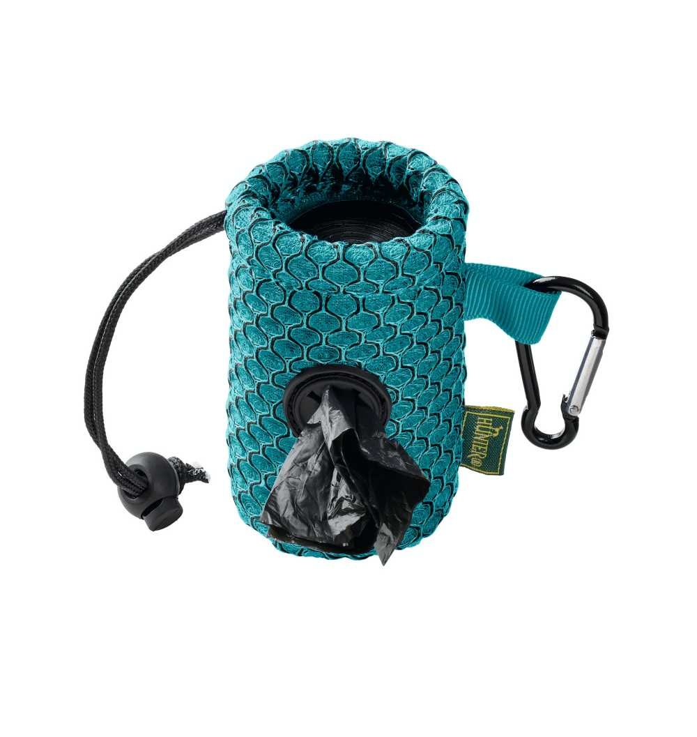 Een innovatieve turquoise poepzakhouder dat is gemaakt van zacht 3D mesh materiaal.