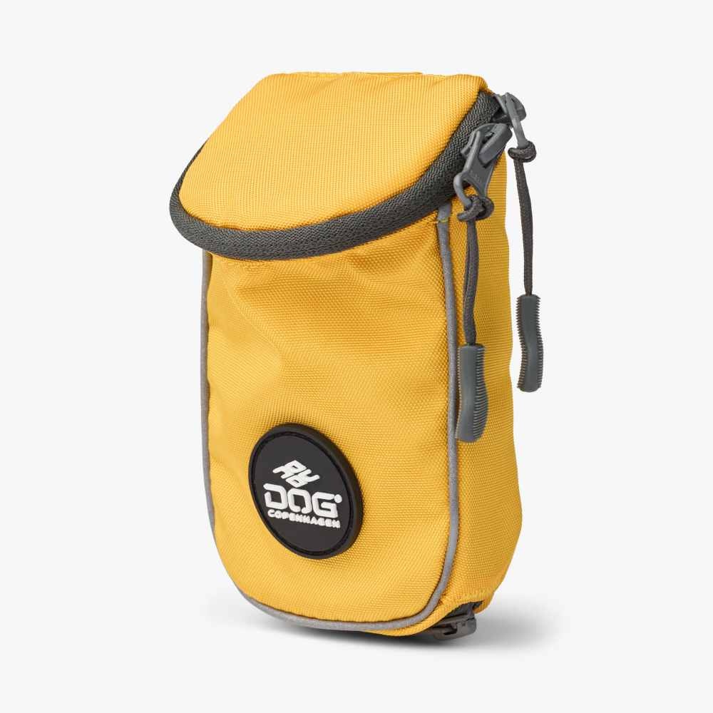 Een handig geel tasje dat u aan een hondenriem bevestigt, Het tasje heeft ruimte voor poepzakjes als ook twee vakjes voor snacks en persoonlijke dingen zoals sleutels.