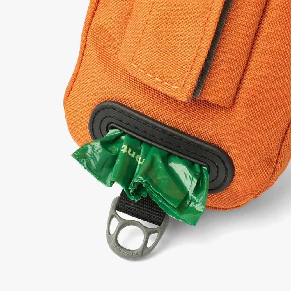 Een handig oranje tasje dat u aan een hondenriem bevestigt, Het tasje heeft ruimte voor poepzakjes als ook twee vakjes voor snacks en persoonlijke dingen zoals sleutels.