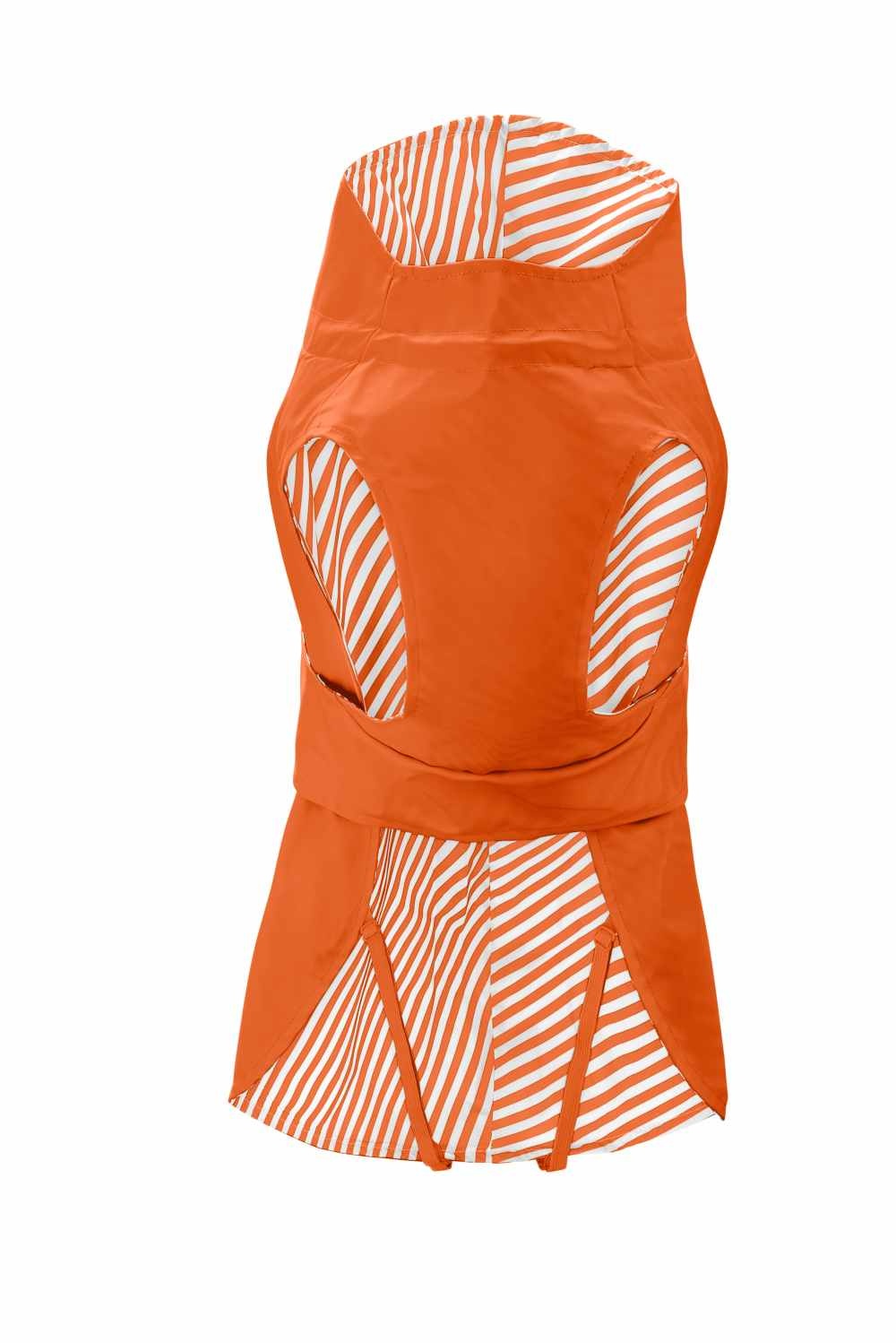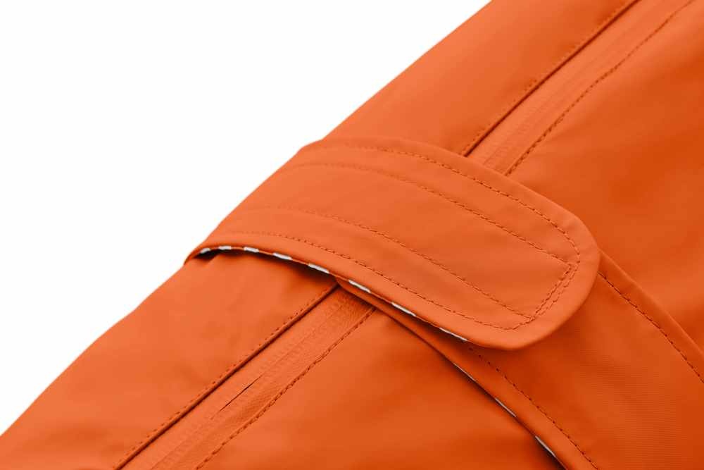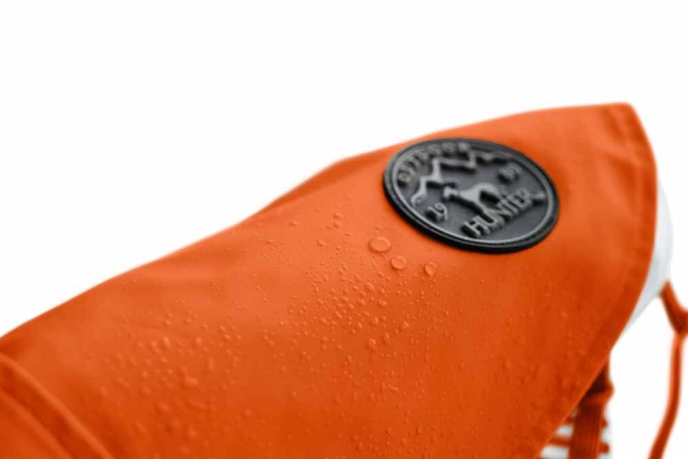 Een waterafstotende en winddichte oranje regenjas voor de hond. De jas heeft een goede ergonomische pasvorm en is op diverse plaatsen verstelbaar. In vele maten leverbaar.