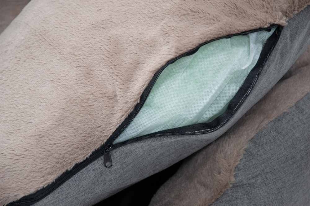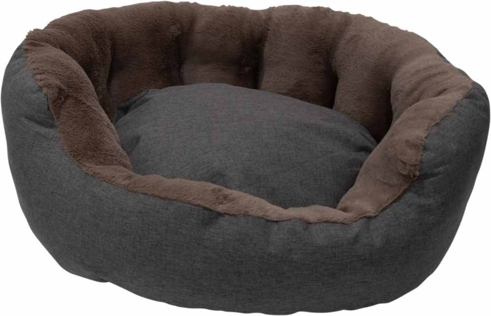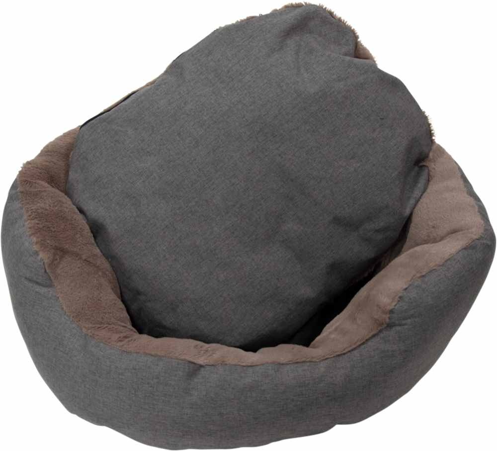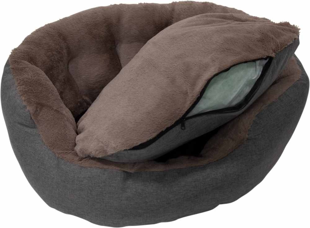 Een fraaie en stijlvolle ronde hondenmand. De binnenzijde is van zacht bruin pluche, de buitenzijde van een stevige grijze stof. . Europese kwaliteit met los en omkeerbaar kussen met een afritsbare hoes, die op max. 30 graden kan worden gewassen.