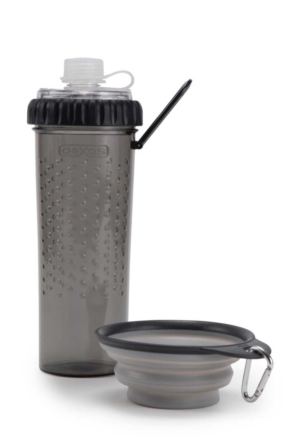 Dit is een handige en unieke grijze drinkfles met twee afzonderlijke afsluitbare compartimenten. Eén compartiment kunt u gebruiken om water voor de hond mee te nemen, en het andere compartiment kunt u gebruiken voor brokjes. En dat is erg handig als u met de hond op stap gaat !