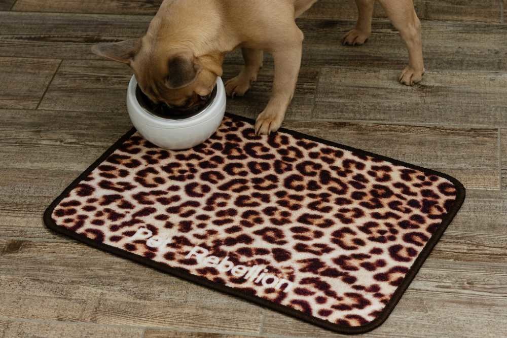 Een praktische en leuke voerbakmat met een luipaard print voor gebruik onder de drinkbak en voerbak van uw hond of kat. Afmetingen 40 x 60 cm.